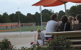 50 auf sonniger Holzterrasse mit Blick auf die Beachvolleyballfelder,