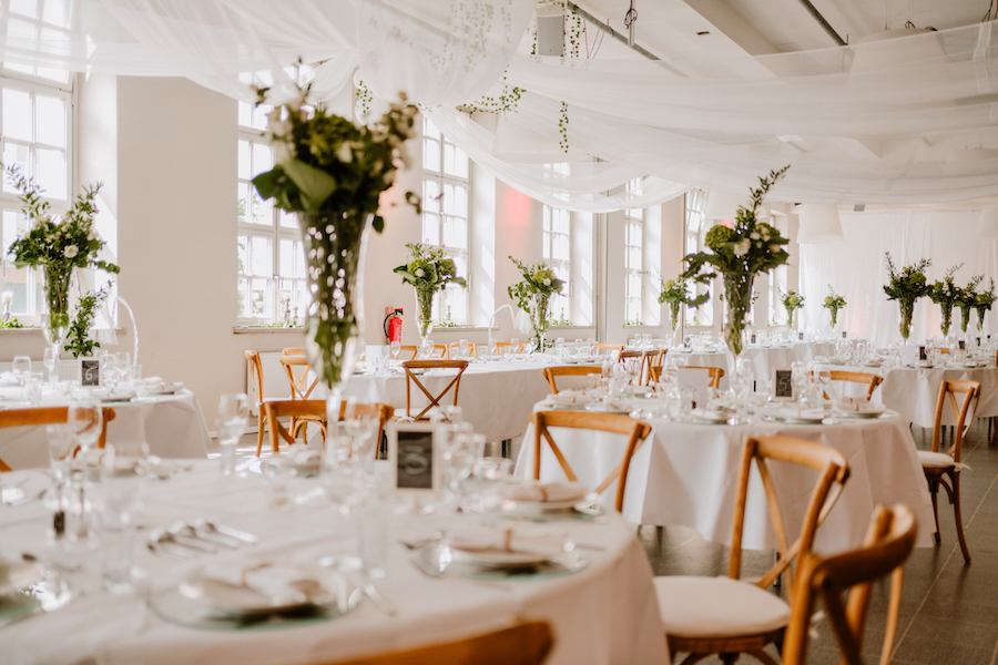 Auf über 1.000 Quadratmetern bietet der Speicher 10 viel Raum für nahezu jede Hochzeitsgröße: Die imposante Backhalle, die sich bei Bedarf teilen lässt, eignet sich mit rund 750 Quadratmetern ideal für große Feiern mit bis zu 750 Gästen. Das lichtdurchflutete Atrium ist ein perfekter Ort für Feste mit bis zu 200 Personen. Ihr möchtet lieber unter freiem Himmel feiern? Auf dem Speicher-Campus steht zudem eine vollständig erschlossene Außenfläche für Empfänge, Dinner und Veranstaltungen jeder Größe zur Verfügung.